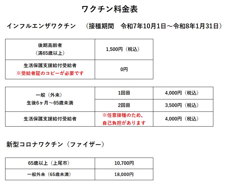 お知らせ 医院からのお知らせをご案内いたします。 インフルエンザワクチン・新型コロナウイルスワクチン接種開始しました。 2025年10月03日 令和7年10月1日より、インフルエンザワクチンと新型コロナウイルスワクチンの接種を開始しました。 予約は必要ございません。診療時間内にお越しください。 « 前の記事